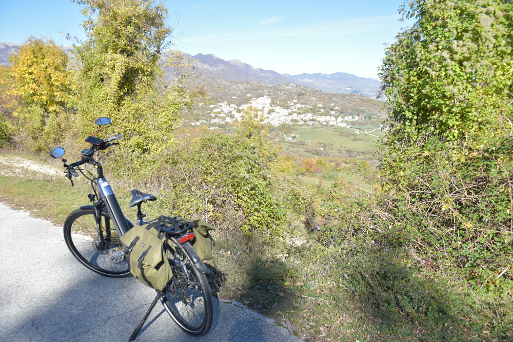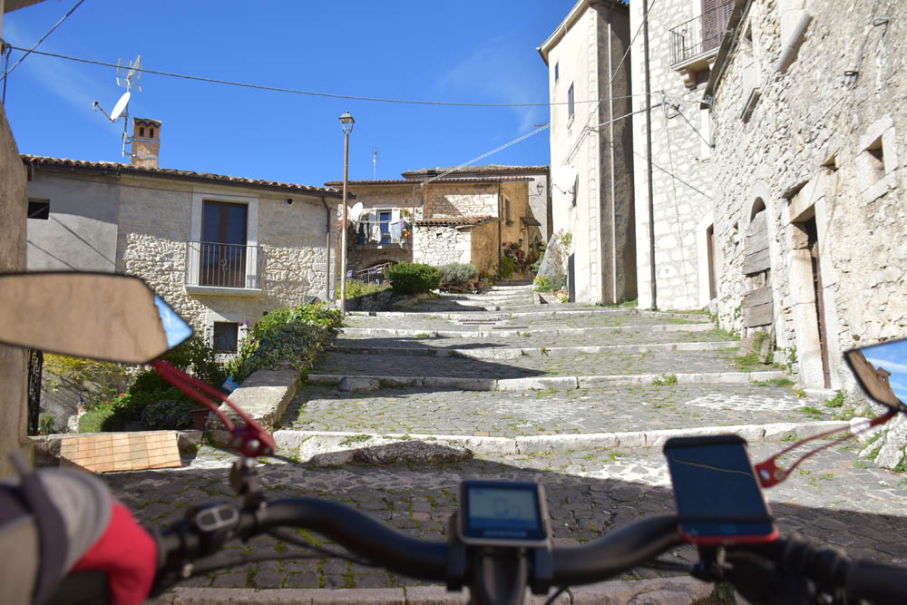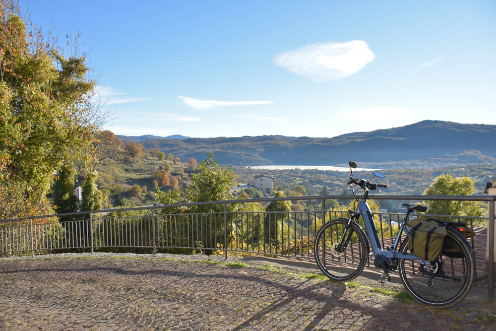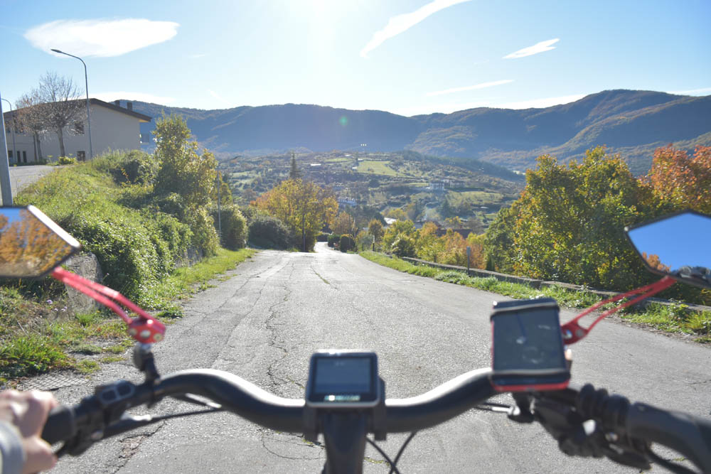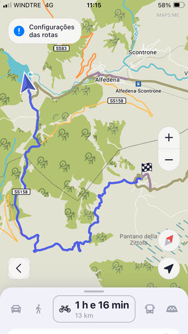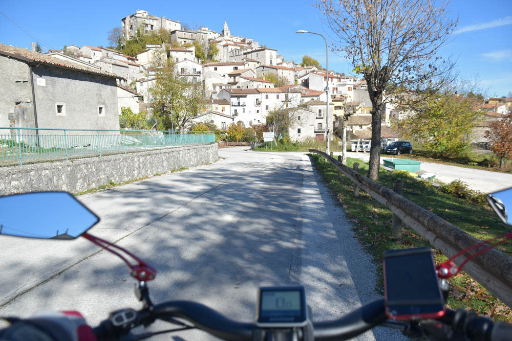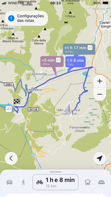 São 8h23 e este é o meu caminho. Estou em Montenero Val Cocchiara e o destino é o lago onde se encontra a bandeira axadrezada. Esqueci-me de gravar uma imagem com o plano das altitudes – subidas e descidas que vou fazer; mas dado que tenho uma bicicleta elétrica, isso já nem tem muita importância.