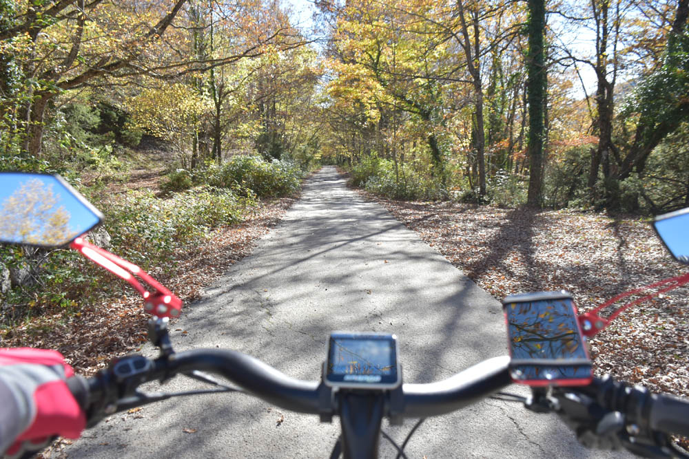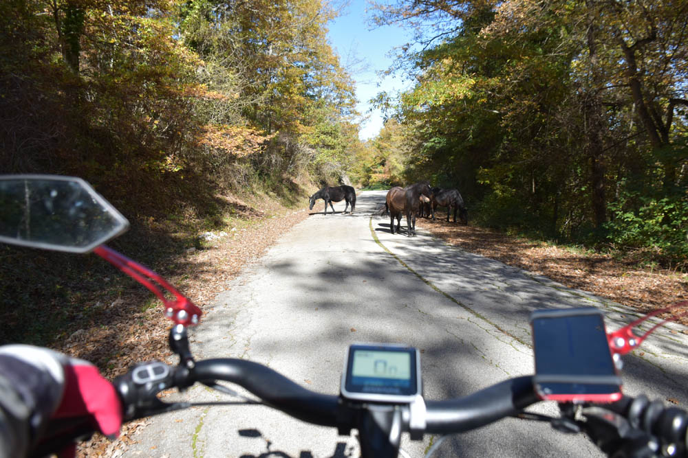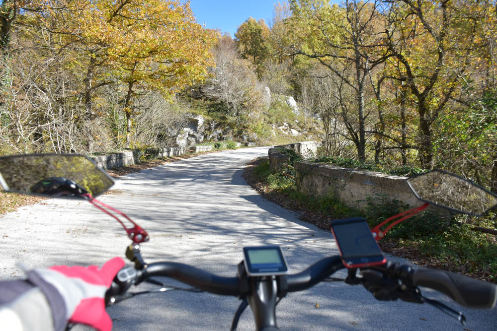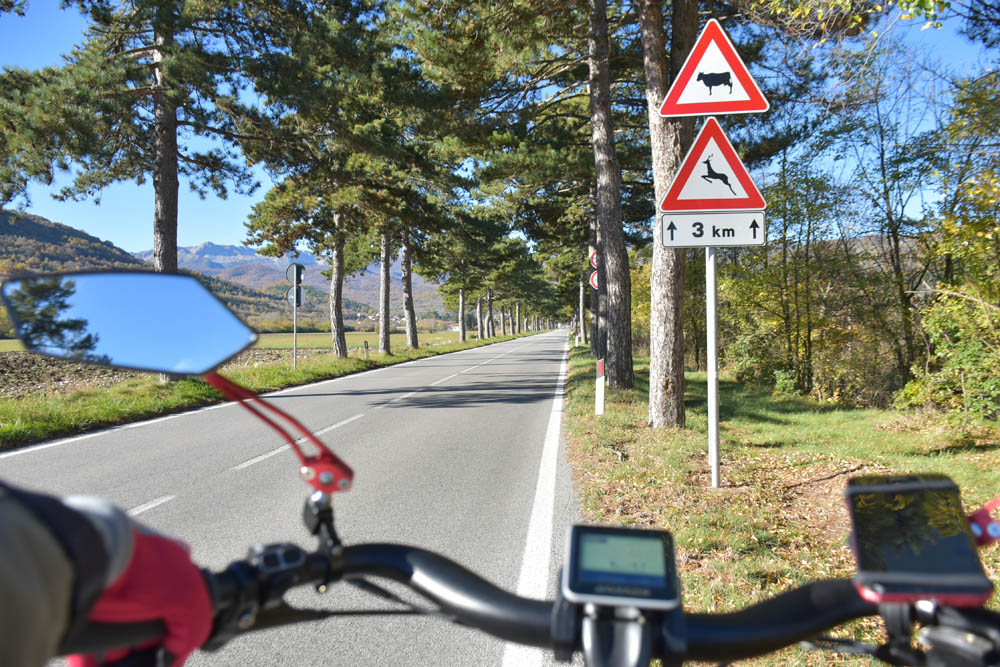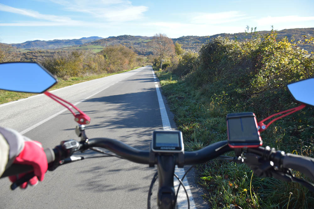 São 8h23 e este é o meu caminho. Estou em Montenero Val Cocchiara e o destino é o lago onde se encontra a bandeira axadrezada. Esqueci-me de gravar uma imagem com o plano das altitudes – subidas e descidas que vou fazer; mas dado que tenho uma bicicleta elétrica, isso já nem tem muita importância.