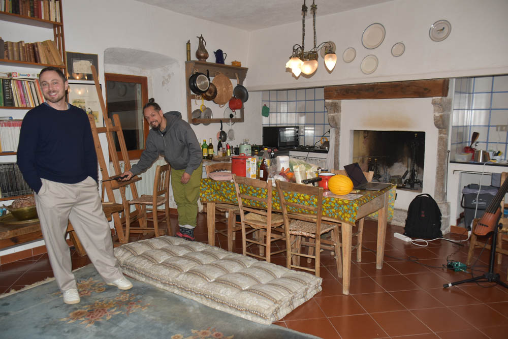 Na sala do Lalo e do Gabriel. No lado direito vê-se o violoncelo elétrico do Lalo. É este que vai tocar e cantar para nós, durante uma meditação que durará 35 minutos. Ainda há outro colchão no chão, que não se vê nesta foto, para quem quiser deitar-se. Eu, cansada como estou, com quase cinco horas de bicicleta, e outras cinco de pintura, estendi-me ali mesmo na carpete e deixei-me descansar durante meia hora, a ouvir o Lalo a cantar e a tocar suavemente. Acho que não sou muito dada a meditações – e disse-o ao Lalo (mas jamais faltaria a esta meditação, com os restantes artistas residentes – exceto a Karolina, que não alinha mesmo nestas coisas), ou então creio que faço meditações com alguma regularidade, porque não noto diferença nenhuma entre uma meditação guiada – como foi esta – e o que eu faço habitualmente. Acho que nem dou conta. Eu apago – esqueço-me de tudo, esqueço-me que estou no planeta Terra – e entro noutro mundo. Talvez seja isto uma meditação.