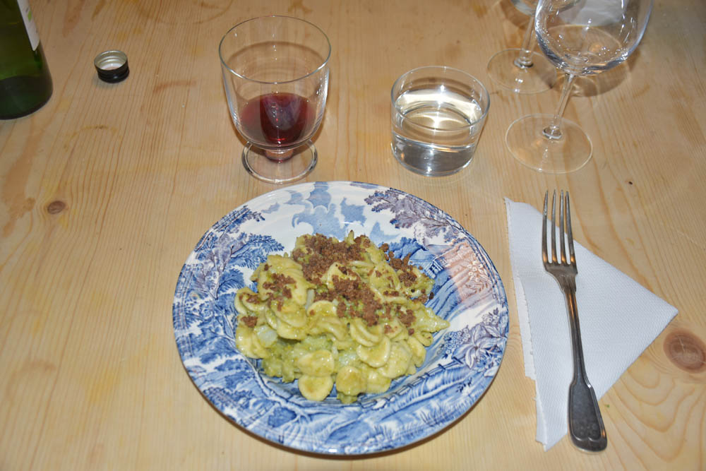 Já de volta aos nossos animados e calorosos jantares, desta vez mais relaxados, e hoje temos “orecchie” (orelhas, em italiano) com brócolos, salpicadas com anchovas trituradas, e molho de limão. O jantar terminou tarde, quase às 11 horas: estivemos à espera que uma deliciosa tarte de maçã acabasse de fazer, feita pela Tee e pela Karolina.