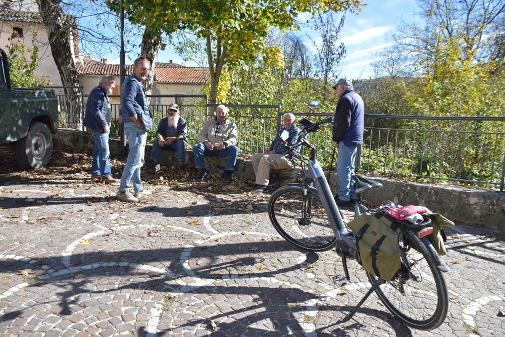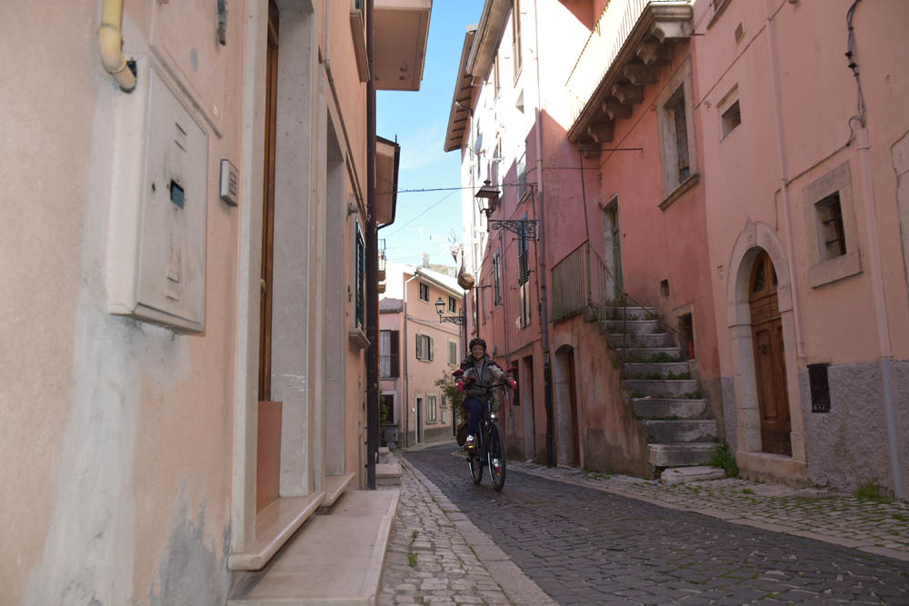 Perguntei a estes montenerenses (não faço ideia qual é o gentílico de Montenero Val Cocchiara!) como é que eu posso chegar ao cemitério, na bicicleta. Eles acharam a minha pergunta estranha, e perguntaram-me porque é que eu quero ir ao cemitério. Porque a partir daí eu sei o caminho para casa! – respondi-lhes. Eu não falo italiano, e eles não falam inglês, mas eu percebi que se eu falar espanhol, os italianos percebem-me. Então fomo-nos entendendo num misto de espanhol e italiano. Expliquei-lhes que estou em casa da Piera, e um deles disse para os amigos: “Laura”. Exato! – exclamei eu, ao ouvir o nome da Laura, a pessoa que cuida das casas alugadas aos turistas. E agora ocupadas pelos artistas residentes, pois claro. Aliás, foi a Laura que me ajudou hoje de manhã a subir as escadas, com a bicicleta. Ao sair de casa, há 22 degraus para subir! Em breve irei desenrascar-me sozinha, com paciência e muitas pausas entre os degraus. Da primeira vez, quem me ajudou foi a Tee, que ia a passar e foi apanhada nesta ingrata tarefa.