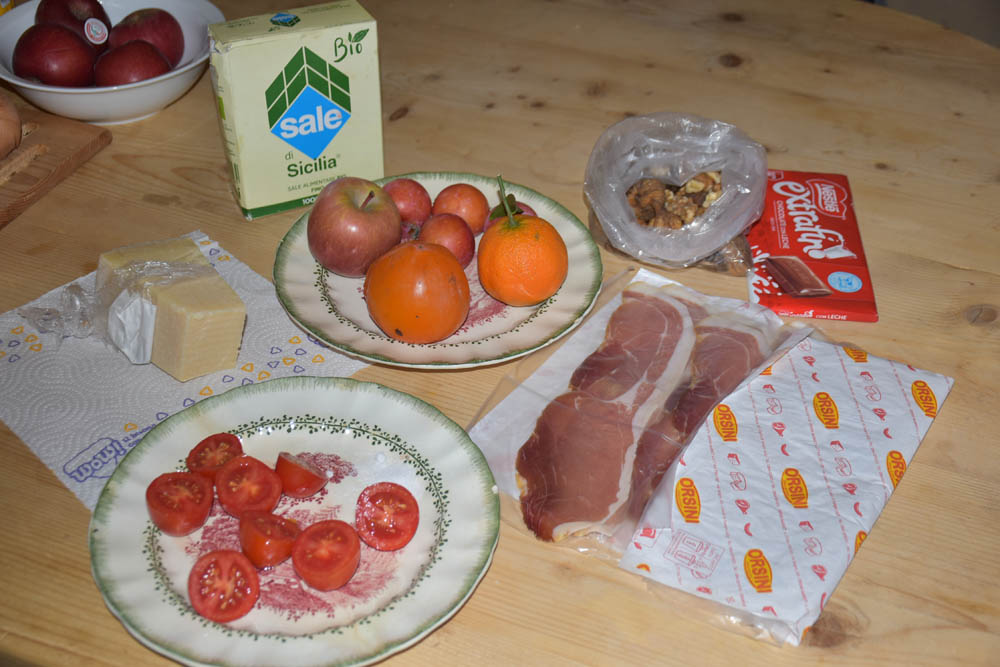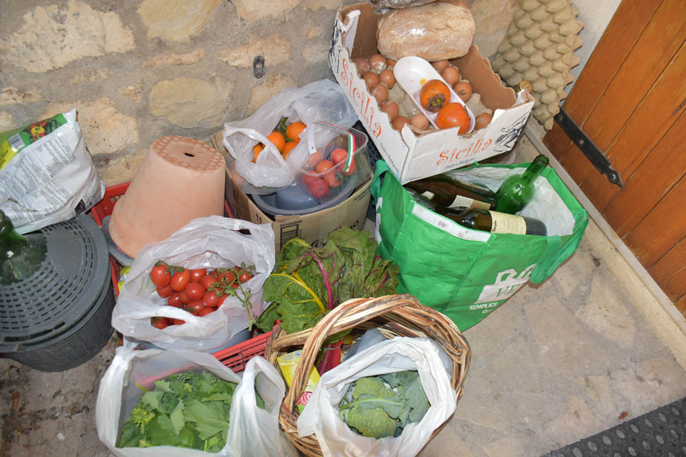 Alguns dos artistas residentes foram às 10 horas a Castel di Sangro, com a Piera, fazer compras. A Piera trouxe-nos isto, está na entrada da sua casa, para nós nos servirmos. A Kina esqueceu-se que os ovos estão aqui, pelos vistos.