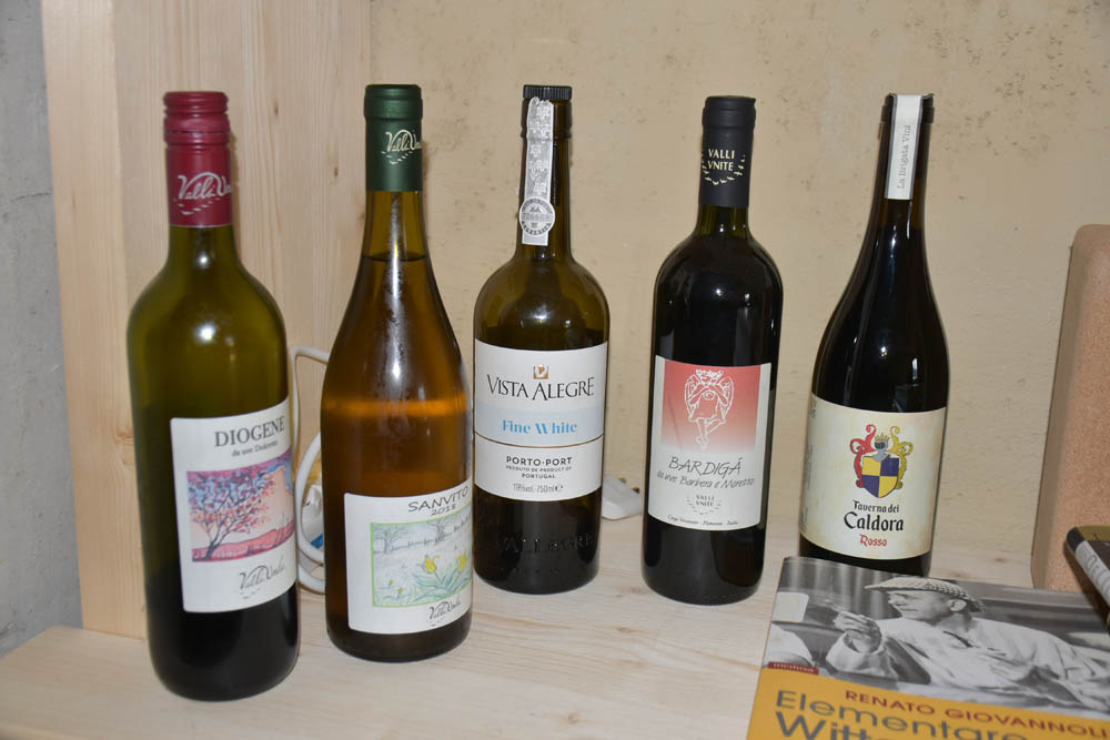 E estas são as garrafas de vinho que tenho na minha casa. As duas da esquerda estão no frigorífico, e as da direita estão nas prateleiras dos livros – vêem-se as cinco garrafas na crónica do primeiro dia, quando cheguei a esta casa e fotografei tudo. Este pessoal quer embebedar-me! E não falta ali um Porto, ao centro.