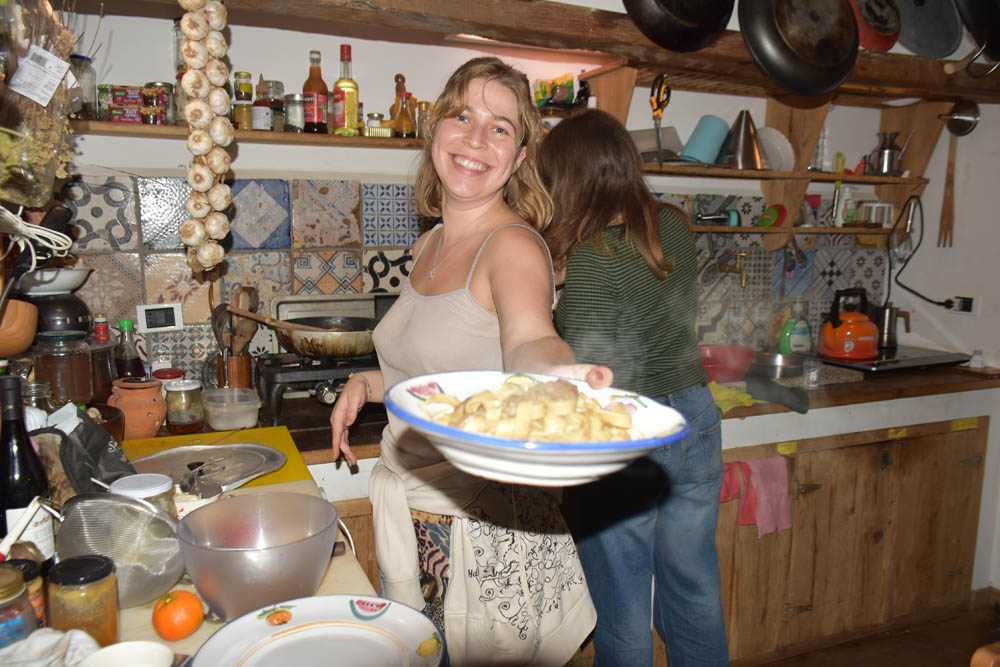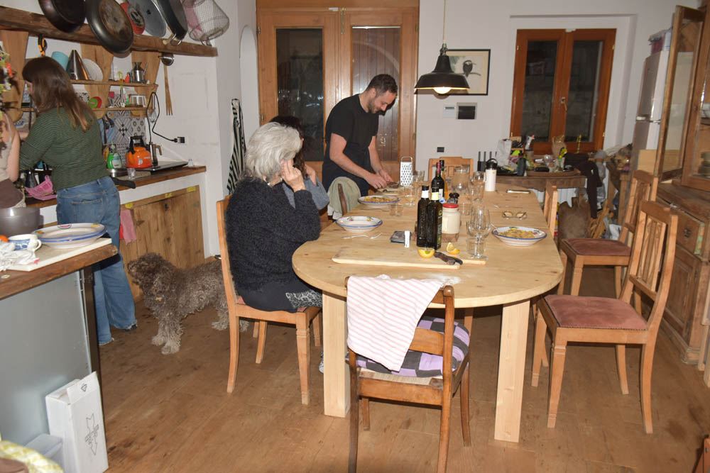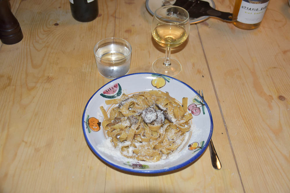 Os sempre deliciosos jantares. Também sou afortunada por estes deliciosos jantares. Massa tagliatelle com molho de cogumelos, e finas fatias de trufas. Queijo ralado em cima. Sobremesa: duas especialidades da pastelaria local, que não fotografei. Uma espécie de pequenino croissant com creme, e uma bolacha com um doce.