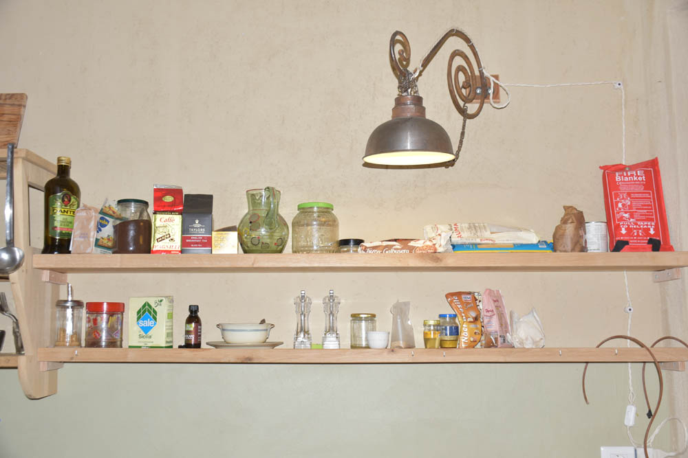 Nesta prateleira, na minha cozinha, tenho uma série de coisas que ainda nem vi com atenção. Azeite, tostas, café, chá, sal, açúcar, bolachas, mais esparguete, e outras coisas que eu nem sei o que são.