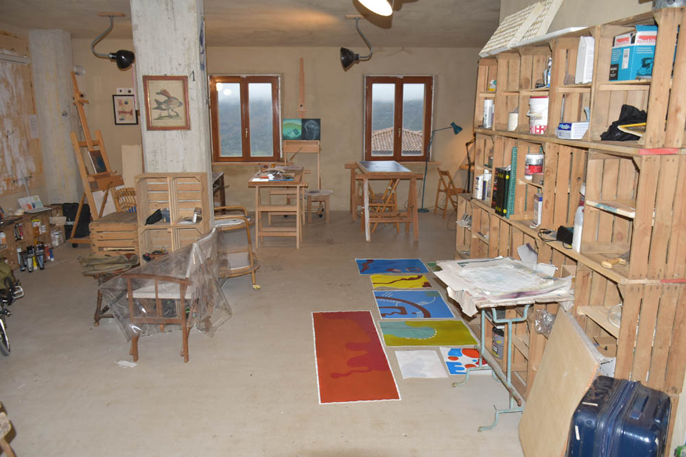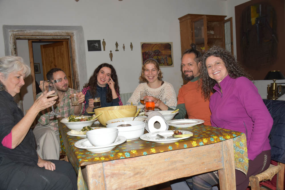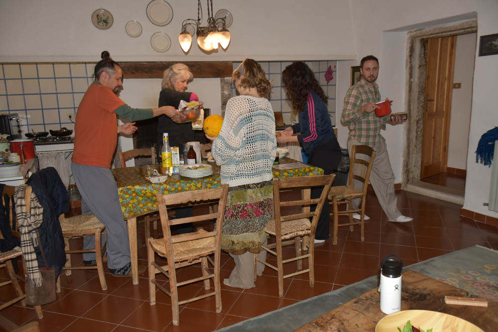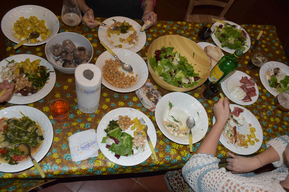 Aos domingos é o único dia em que o jantar não é servido aos artistas residentes, pelo que todos combinámos levar qualquer coisa e reunirmo-nos na mesma, desta vez em casa do Gabriel e do Lalo. O encontro era às 18 horas. E o pessoal afinal cozinhou, não levaram apenas coisas pré-feitas. Eu pintei até às 18h45 e não cozinhei nada. Levei apenas uma embalagem de amêndoas, avelãs e frutos secos. Então lavei a louça no final, como compensação. O pessoal não queria, chamou-me várias vezes para eu regressar à mesa, mas eu lavei a louça com alguma rapidez, e com água quente, não custou nada, sempre contribuí com alguma coisa. Quem vê estas crónicas até pensa que eu não cozinho nada, quando eu sou conhecida pelos meus amigos e família mais chegada, por cozinhar bastante bem, e pratos relativamente trabalhosos e elaborados. Mas aqui eu tenho 14 dias, e tenho mais que fazer do que ocupar tempo na cozinha. Eu quero pintar. Não quero perder nem trinta minutos a cozinhar. É uma questão de gerir prioridades. Todo o ano eu cozinho em minha casa, em Lisboa, não preciso de cozinhar aqui também, como aliás tenho mostrado nas crónicas anteriores, e continuarei a mostrar nas próximas. Além do mais, vou deixar Itália com peso a mais, de certeza, com tanta (deliciosa) comida.