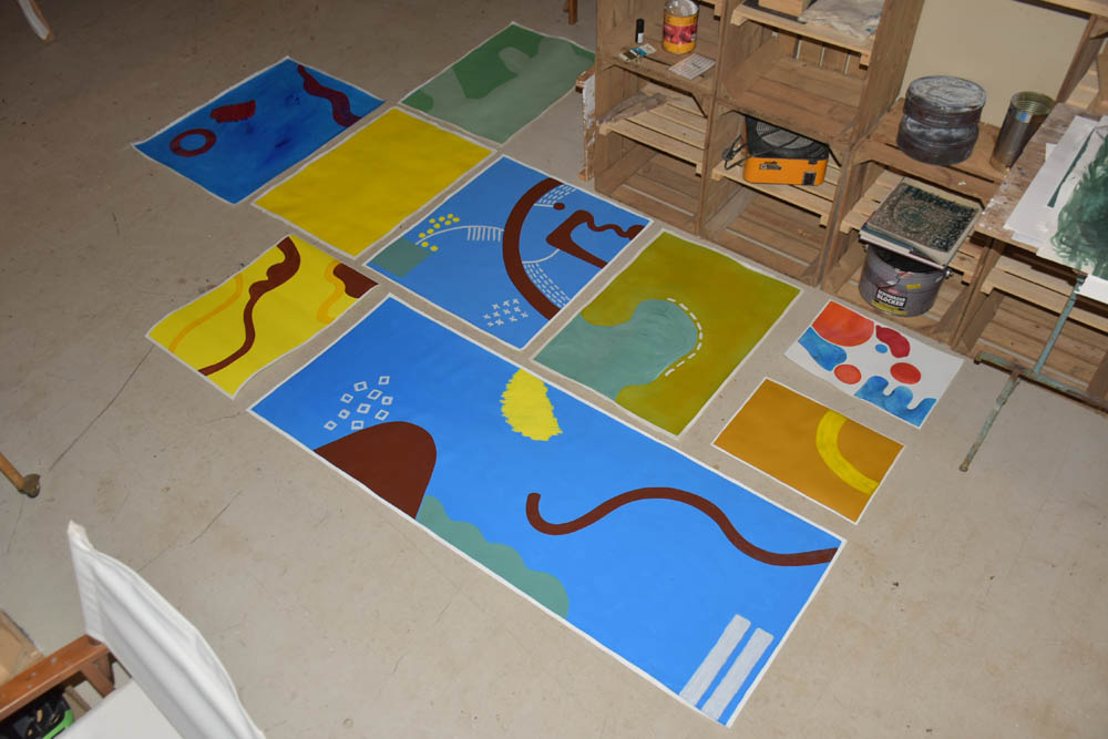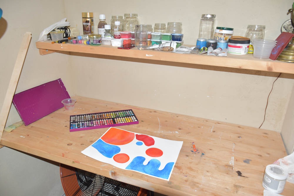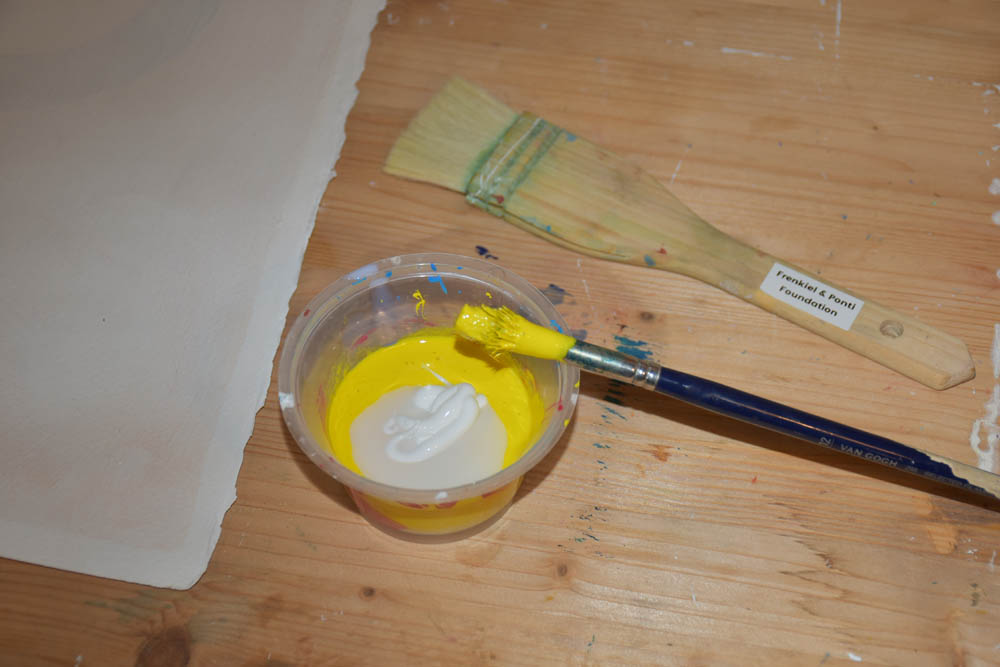O pincel pequeno é meu, está muito gasto, é usado para estes trabalhos grosseiros, nomeadamente de mistura de tintas e médiuns.