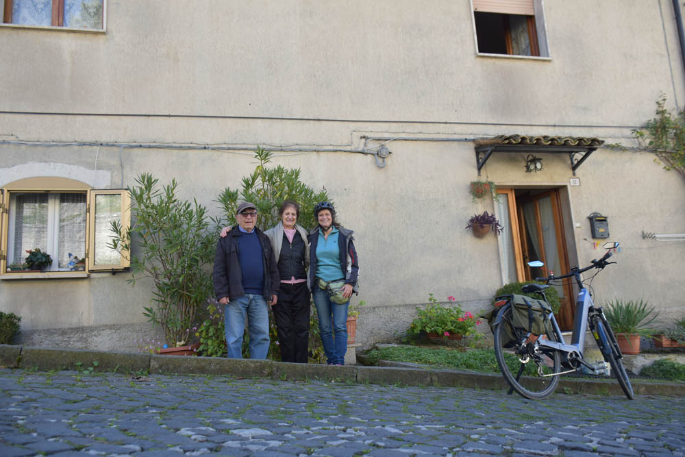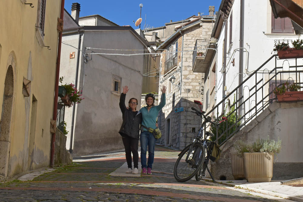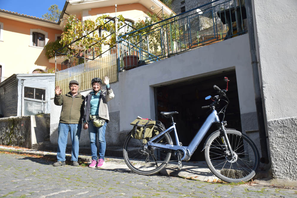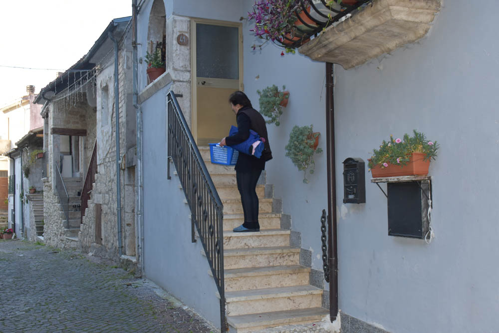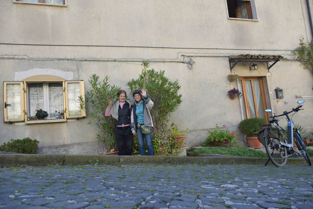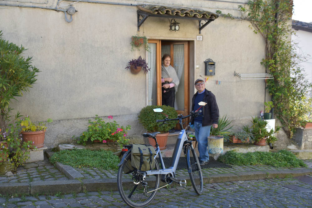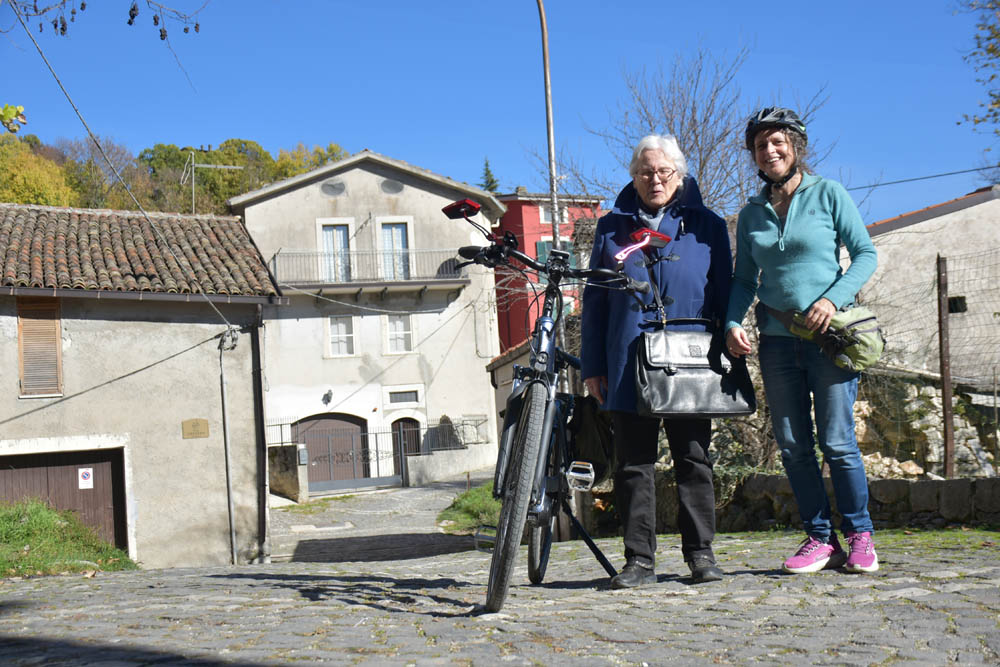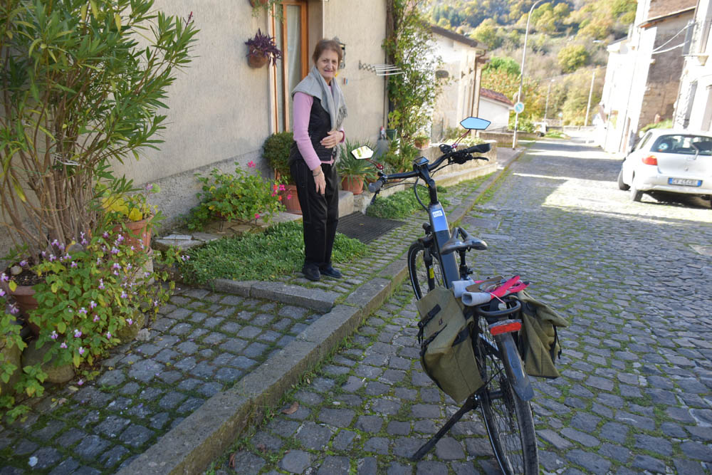 A Giuliana vinha a subir a rua, com um saco de compras na mão. Eu estava parada, na bicicleta, a olhar e a tirar fotografias, como é hábito, e esperei que a Giuliana subisse a rua – teria inevitavelmente que passar por mim. “A bicicleta não anda?” – perguntou-me. Eu ri-me. “Anda, estou apenas a descansar” – respondi-lhe. Uma pequena mentira, porque estou mais do que descansada. Tenho outras duas fotos – porque programei a máquina para nos tirar três – e a Giuliana conseguiu pestanejar em todas elas, e ficar de olhos fechados. O saco de compras ficou atrás da máquina fotográfica. Conversámos uns minutos: a Giuliana nasceu e vive aqui em Montenero, mas fala um espanhol perfeito – e disse-me que vai inaugurar um museu, amanhã às 16h, na biblioteca, para eu aparecer e levar os restantes artistas da residência. Ela e um grupo de outras pessoas aqui da aldeia são as responsáveis pela criação deste museu, dedicado a Montenero Val Cocchiara. Claro que vou, respondi-lhe, e divulgarei. (A biblioteca fotografei-a logo no dia 2, fica ao lado da casa onde estou alojada).