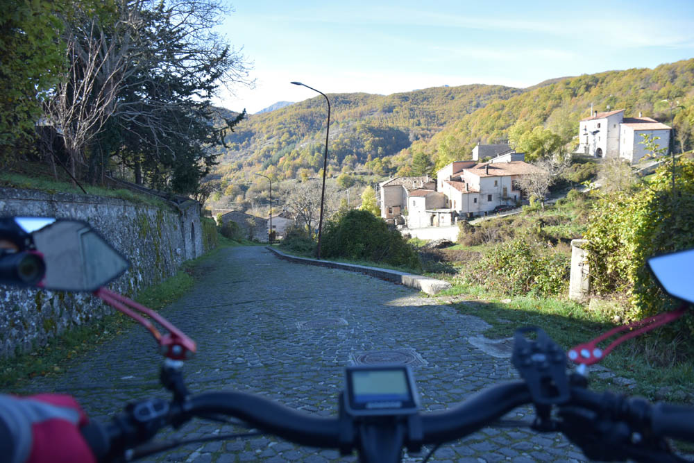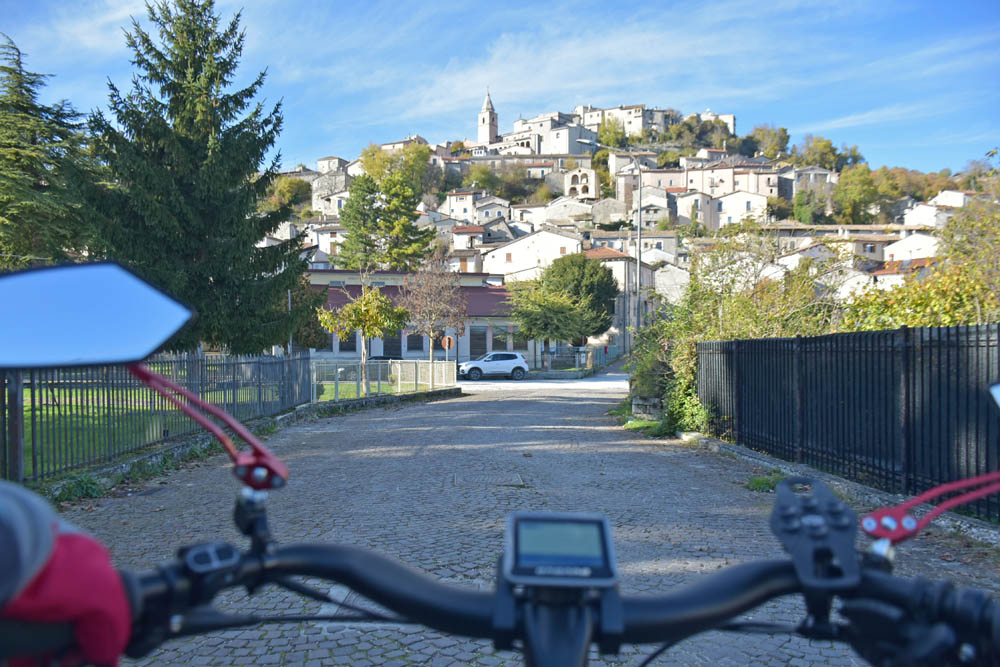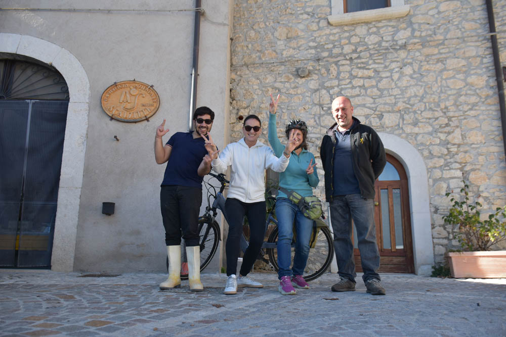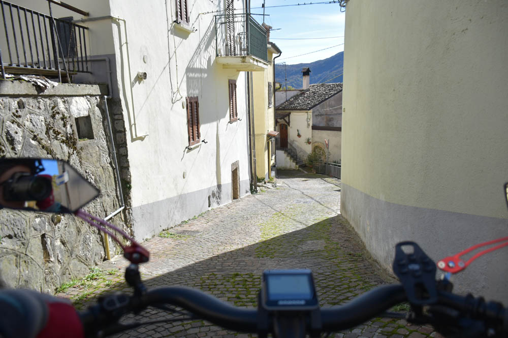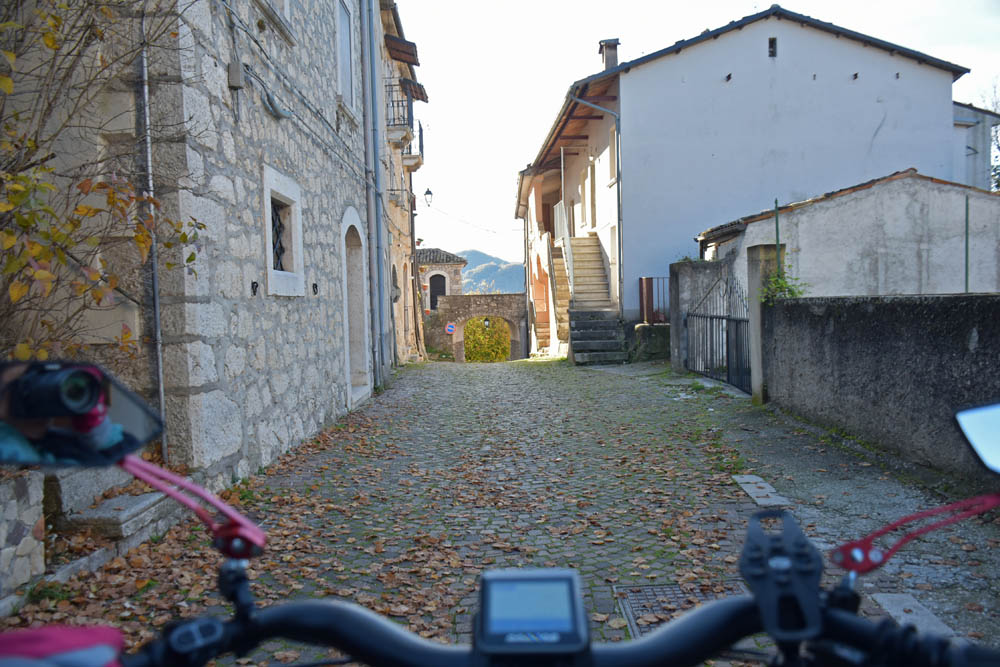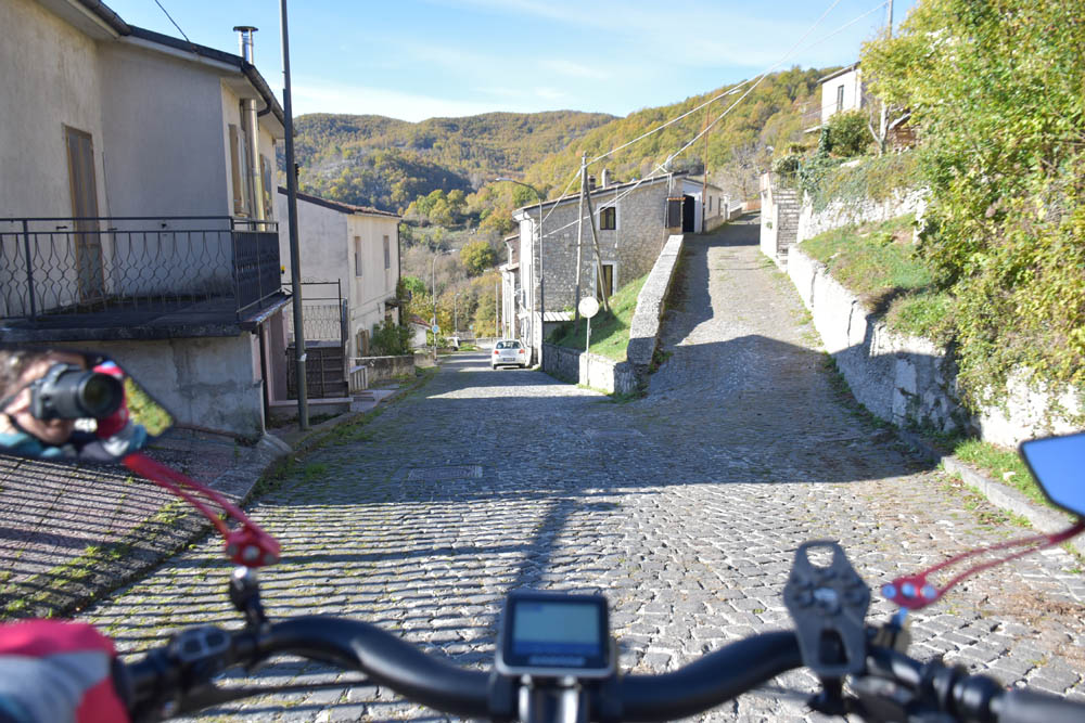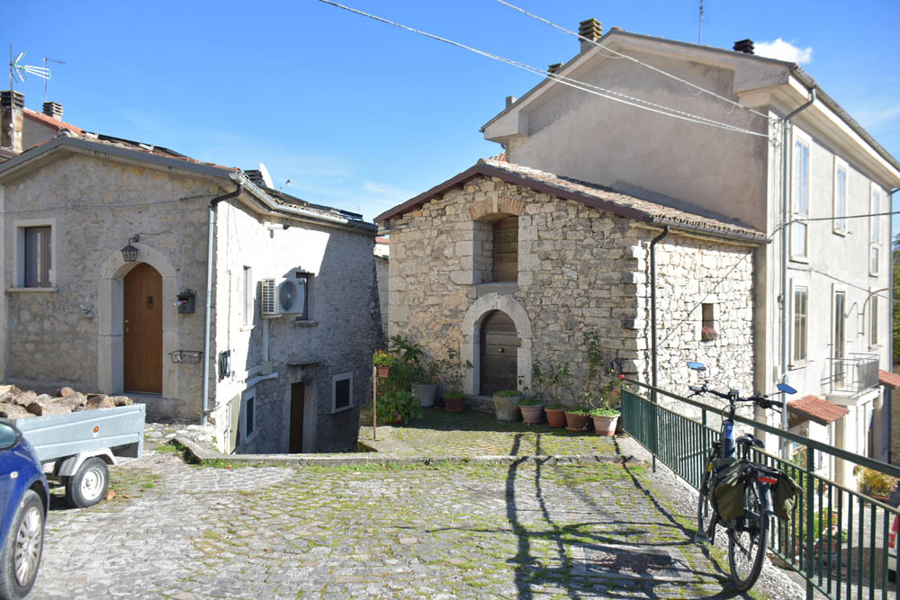 A Giuliana vinha a subir a rua, com um saco de compras na mão. Eu estava parada, na bicicleta, a olhar e a tirar fotografias, como é hábito, e esperei que a Giuliana subisse a rua – teria inevitavelmente que passar por mim. “A bicicleta não anda?” – perguntou-me. Eu ri-me. “Anda, estou apenas a descansar” – respondi-lhe. Uma pequena mentira, porque estou mais do que descansada. Tenho outras duas fotos – porque programei a máquina para nos tirar três – e a Giuliana conseguiu pestanejar em todas elas, e ficar de olhos fechados. O saco de compras ficou atrás da máquina fotográfica. Conversámos uns minutos: a Giuliana nasceu e vive aqui em Montenero, mas fala um espanhol perfeito – e disse-me que vai inaugurar um museu, amanhã às 16h, na biblioteca, para eu aparecer e levar os restantes artistas da residência. Ela e um grupo de outras pessoas aqui da aldeia são as responsáveis pela criação deste museu, dedicado a Montenero Val Cocchiara. Claro que vou, respondi-lhe, e divulgarei. (A biblioteca fotografei-a logo no dia 2, fica ao lado da casa onde estou alojada).
