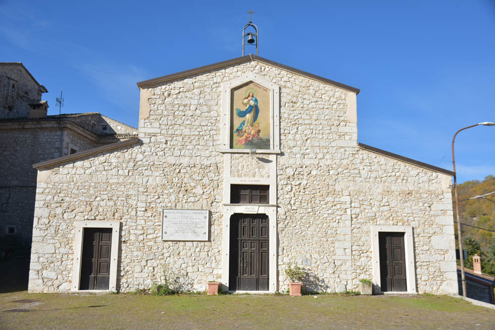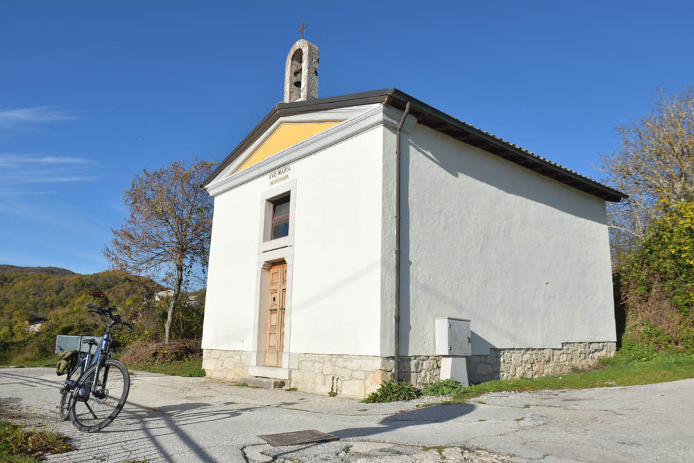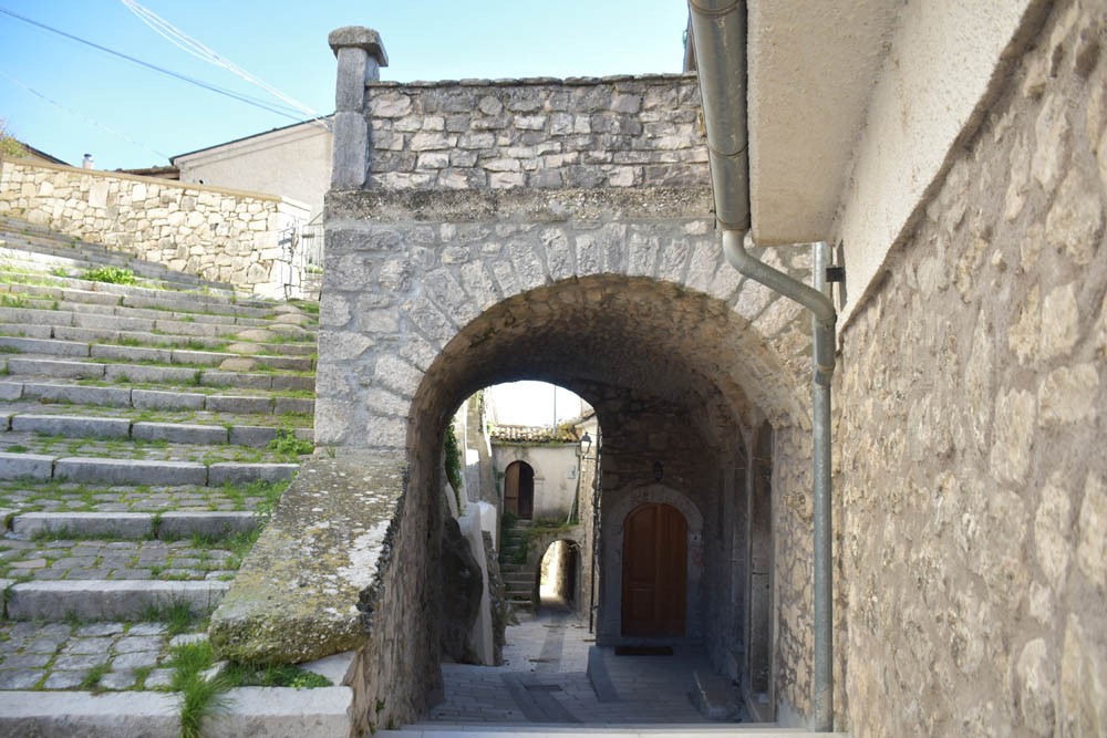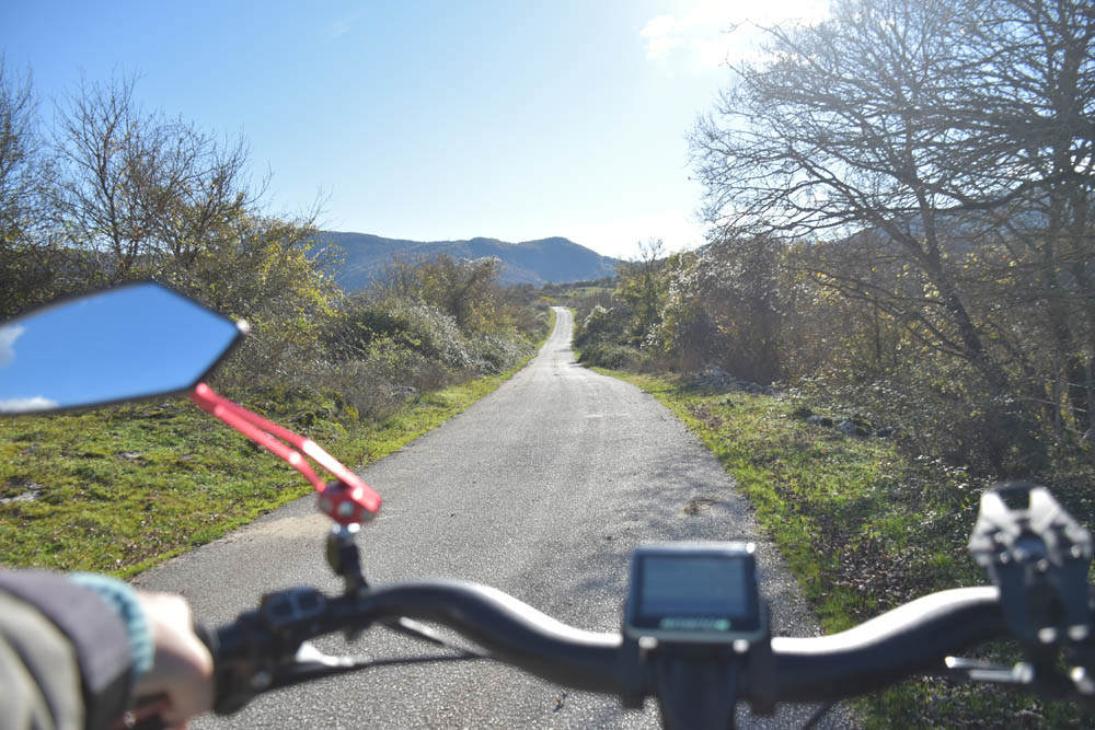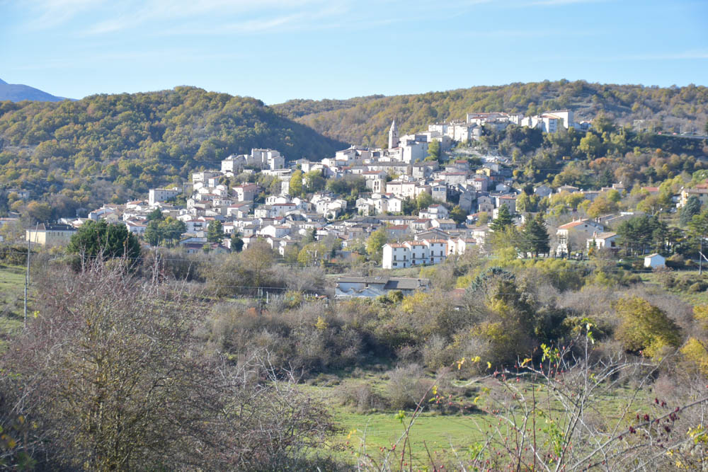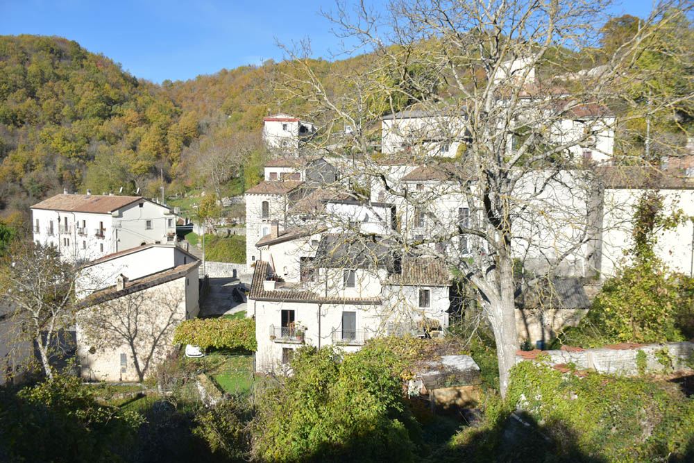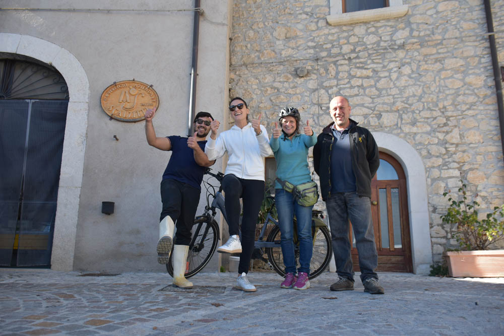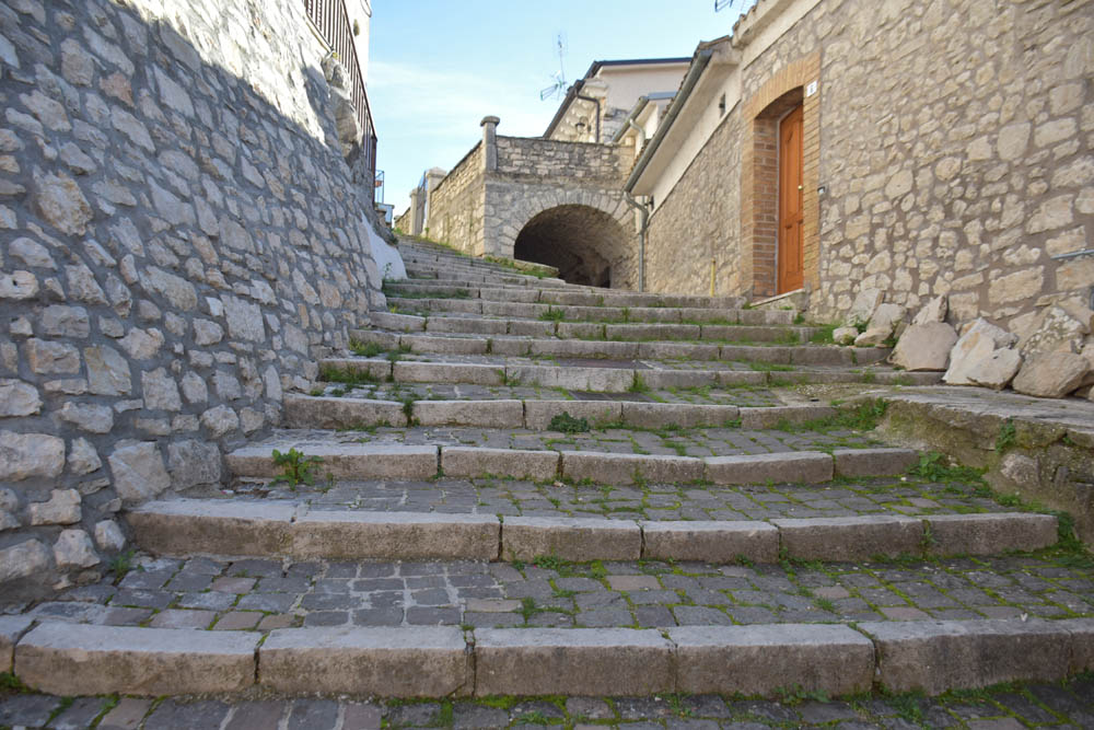 A Giuliana vinha a subir a rua, com um saco de compras na mão. Eu estava parada, na bicicleta, a olhar e a tirar fotografias, como é hábito, e esperei que a Giuliana subisse a rua – teria inevitavelmente que passar por mim. “A bicicleta não anda?” – perguntou-me. Eu ri-me. “Anda, estou apenas a descansar” – respondi-lhe. Uma pequena mentira, porque estou mais do que descansada. Tenho outras duas fotos – porque programei a máquina para nos tirar três – e a Giuliana conseguiu pestanejar em todas elas, e ficar de olhos fechados. O saco de compras ficou atrás da máquina fotográfica. Conversámos uns minutos: a Giuliana nasceu e vive aqui em Montenero, mas fala um espanhol perfeito – e disse-me que vai inaugurar um museu, amanhã às 16h, na biblioteca, para eu aparecer e levar os restantes artistas da residência. Ela e um grupo de outras pessoas aqui da aldeia são as responsáveis pela criação deste museu, dedicado a Montenero Val Cocchiara. Claro que vou, respondi-lhe, e divulgarei. (A biblioteca fotografei-a logo no dia 2, fica ao lado da casa onde estou alojada).