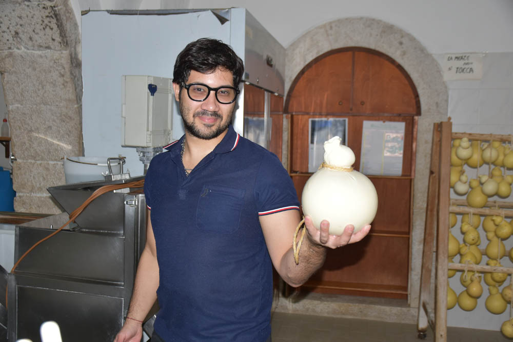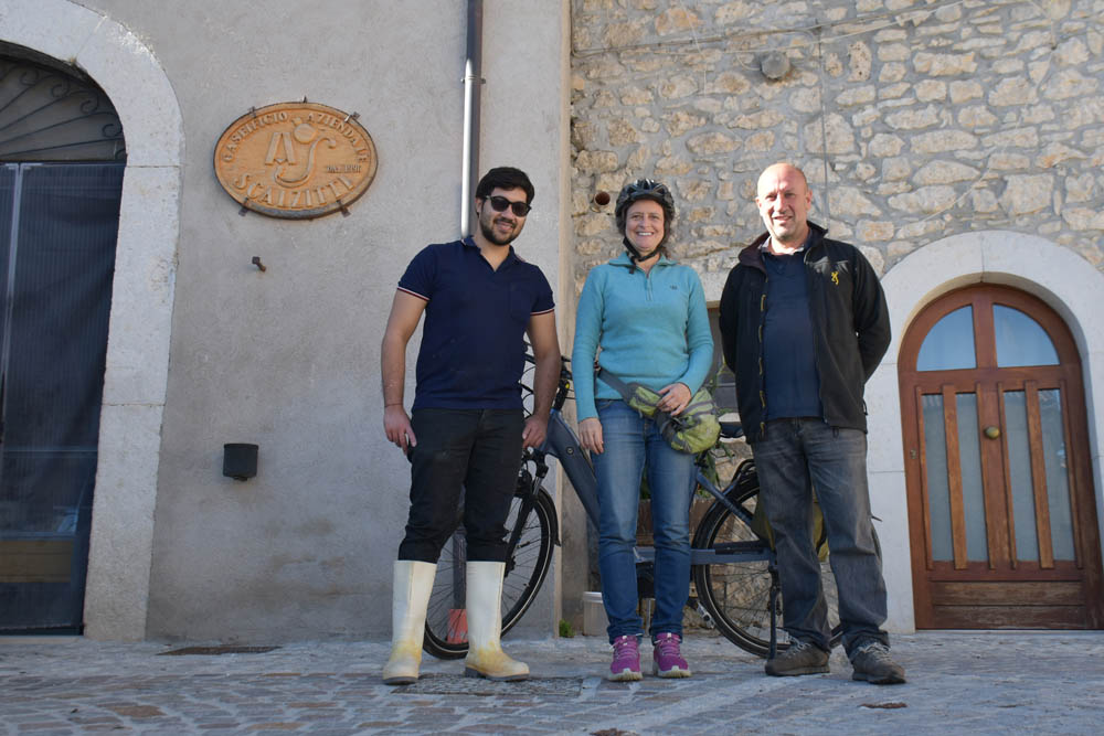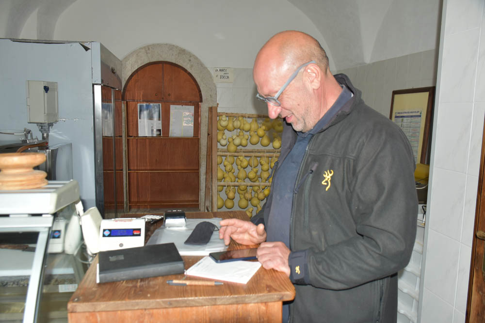 Agora conheci o Nicola, à esquerda, e o Albino, à direita. O Nicola é venezuelano e trabalha aqui há 7 anos, para o Albino. Este, por seu turno, é o dono desta queijaria, à esquerda. Vê-se um pouco da bancada com os queijos à venda, por detrás da rede. O Albino explicou-me o significado da placa de madeira, na parede: “Caseificio aziendale” significa queijaria da própria exploração agrícola, ou seja, é um caseificio (queijaria) que produz queijo utilizando o leite produzido aqui mesmo em Montenero Val Cocchiara.