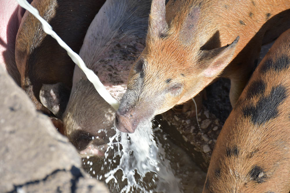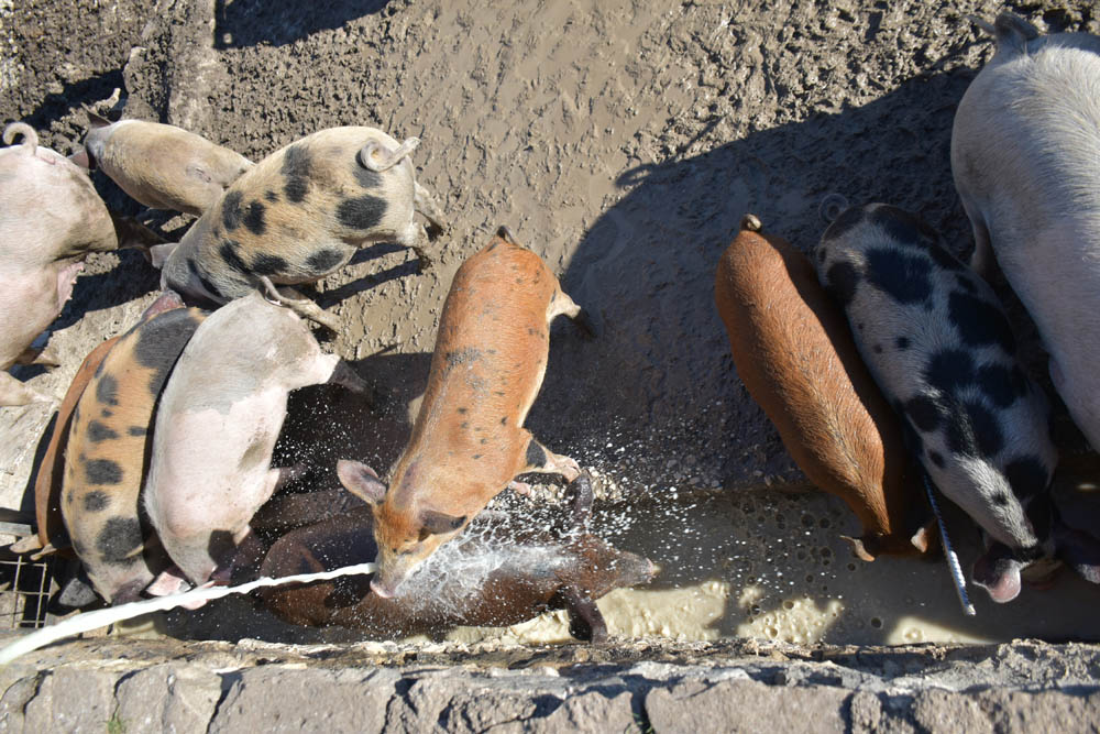 Vai dar soro de leite aos porcos. Estes grunhiram imenso, foi uma gritaria enorme, porque queriam todos chegar ao mesmo tempo, ao soro. Empurravam-se uns aos outros. Mas o soro vai correr durante muito tempo, chega para todos, e alguns até irão banhar-se nele.