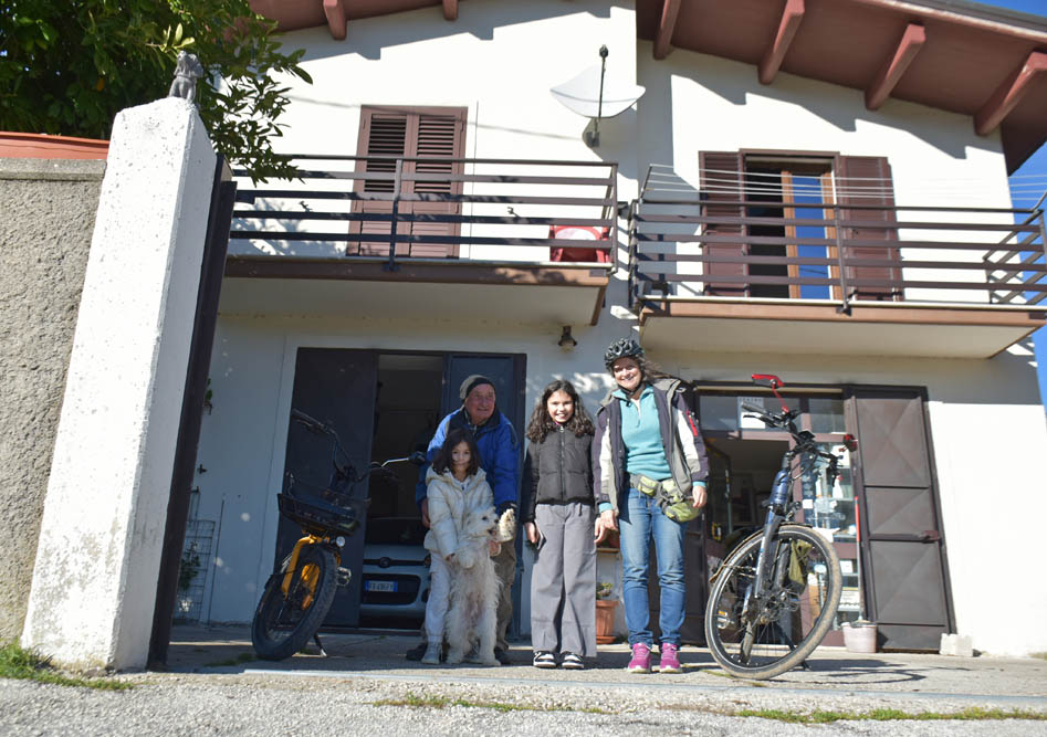 Mas ainda tenho outra paragem inesperada – a casa do Luigi, com quem já me cruzei nas crónicas 4 e 9. O Luigi é o dono daquela bicicleta elétrica amarela, e mora aqui. Estas são as suas netas: de quispo branco é a Flavia, de quispo preto é a Carola.