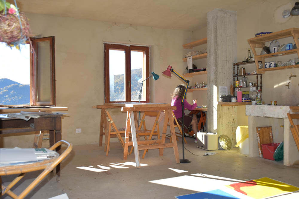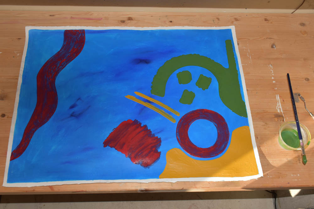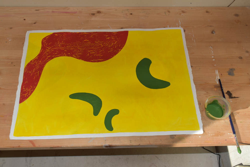 Voltei ao acrílico e à papa do Nestum – ou do italiano Plasmon, como descrevi no dia 8. Ou se calhar esta é uma papa de espinafres. É muito difícil pintar com isto – mas eu esforço-me porque me apetece pintar. Desalmadamente. Óleo agora é que já não dá mesmo, não secará antes da residência terminar.