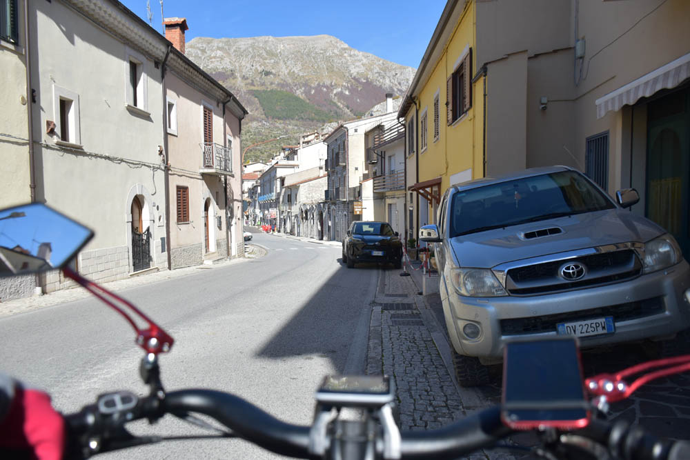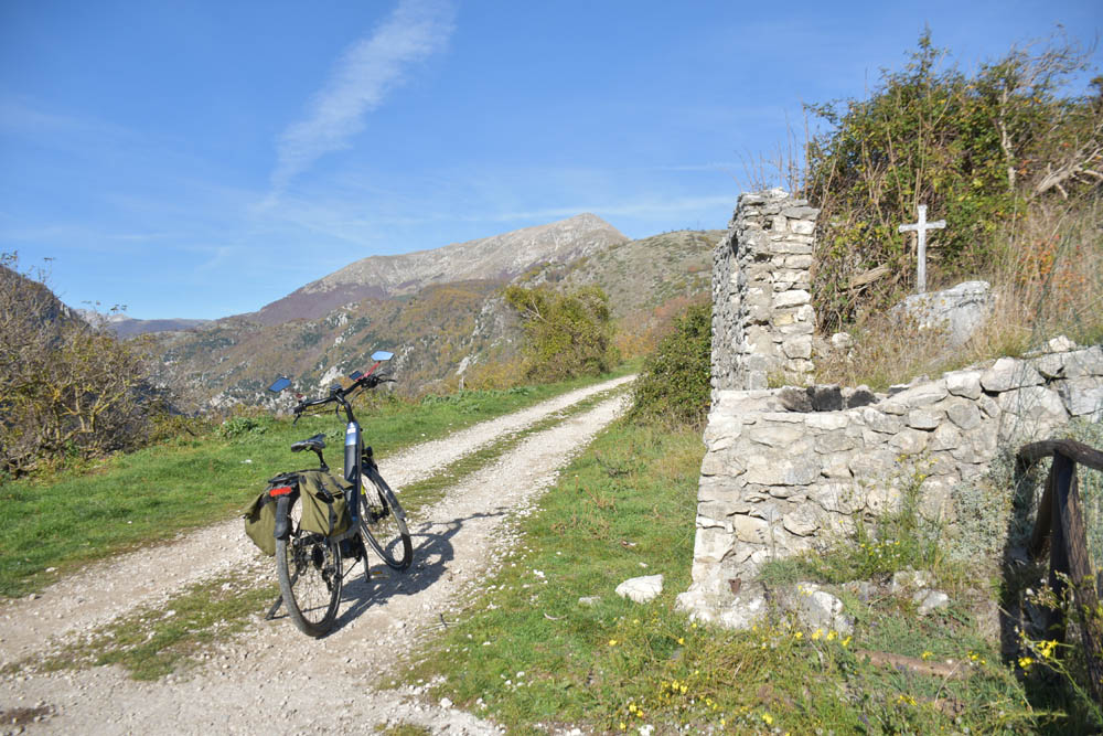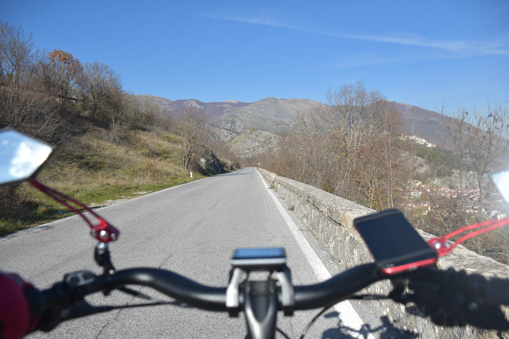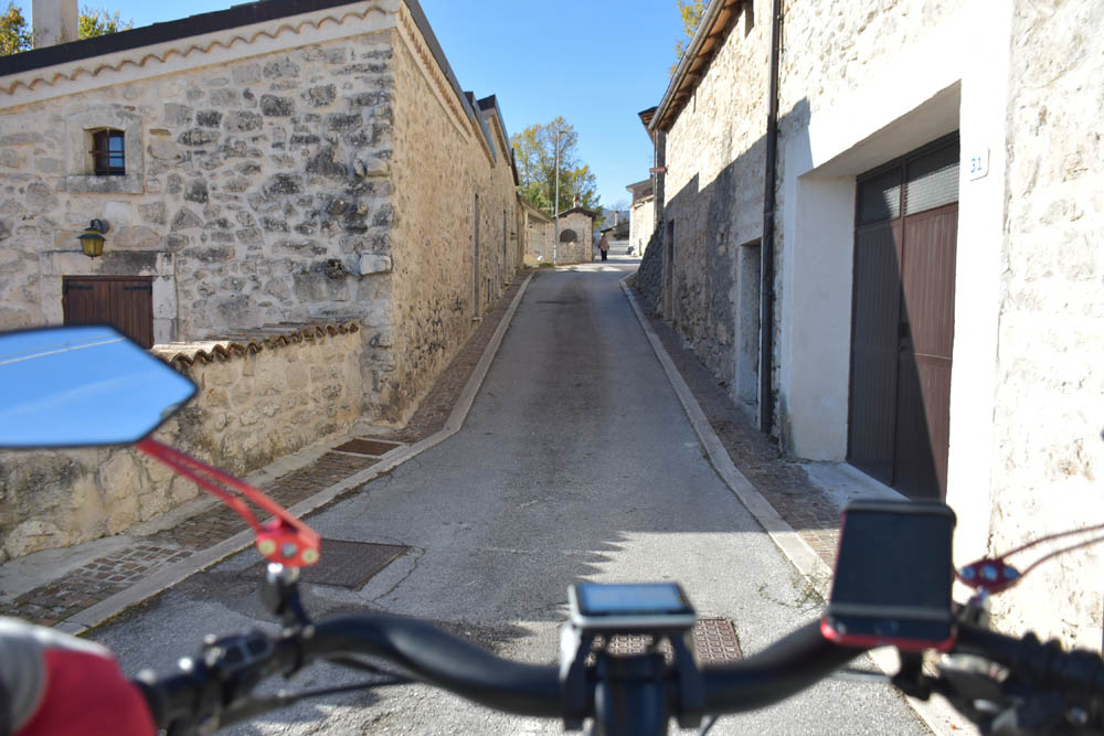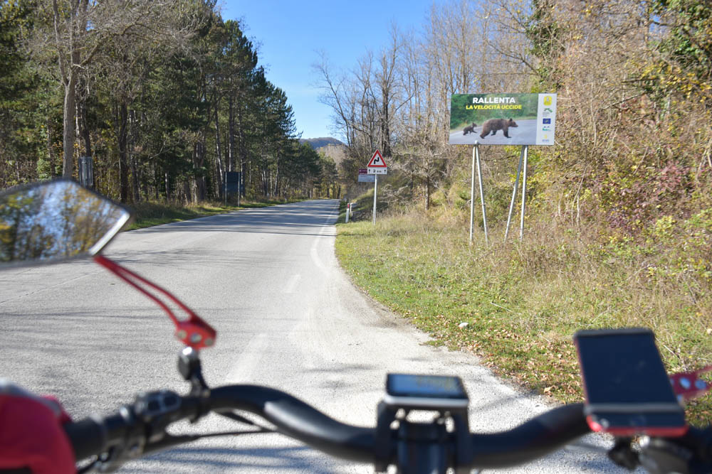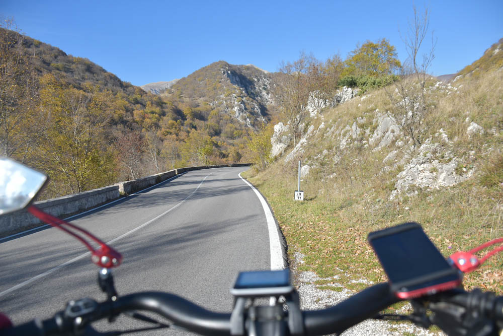 E agora a parte difícil: um caminho pelas montanhas até ao Lago di Barrea. Ontem à noite, em Montenero Val Cocchiara, a aplicação Maps.me dizia-me que não existiam caminhos para bicicleta entre Scontrone e o Lago. Hoje já me dá este caminho – mas é o mesmo dos peões. Ou seja, hoje também já é caminho de bicicleta. Fiquei animada. Mas a minha animação não vai durar muito tempo.