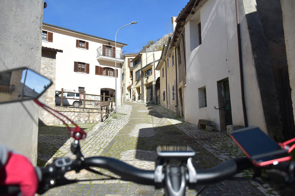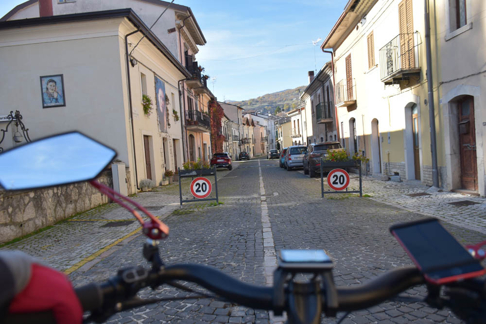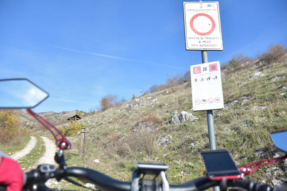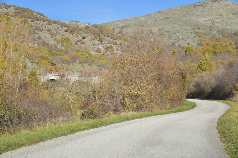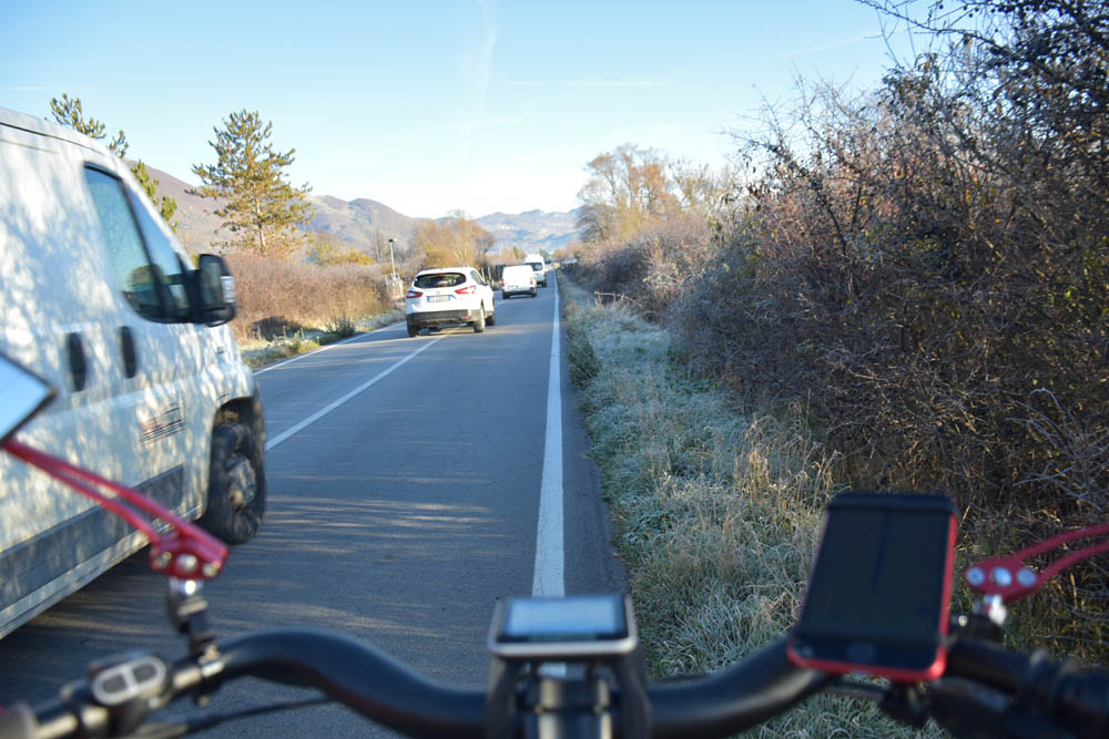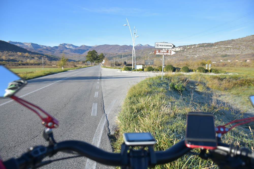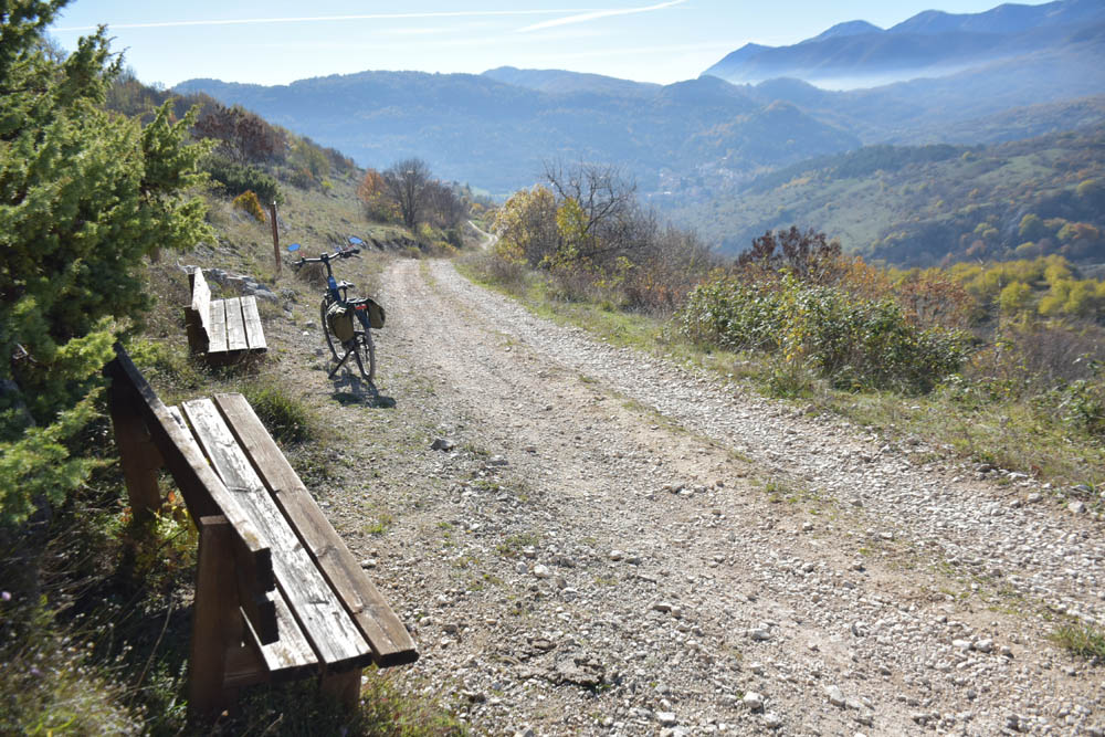 E agora a parte difícil: um caminho pelas montanhas até ao Lago di Barrea. Ontem à noite, em Montenero Val Cocchiara, a aplicação Maps.me dizia-me que não existiam caminhos para bicicleta entre Scontrone e o Lago. Hoje já me dá este caminho – mas é o mesmo dos peões. Ou seja, hoje também já é caminho de bicicleta. Fiquei animada. Mas a minha animação não vai durar muito tempo.