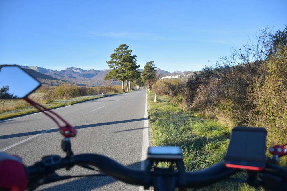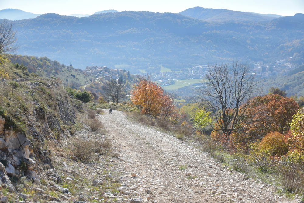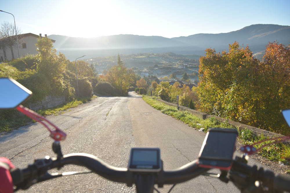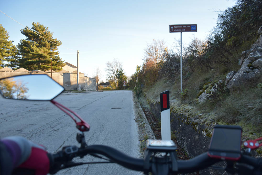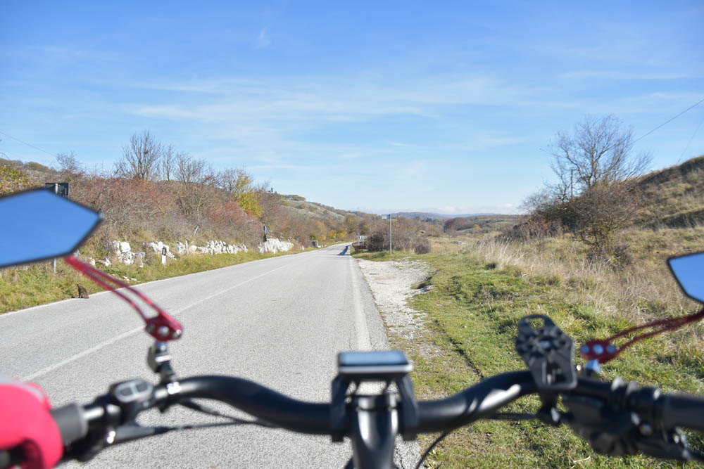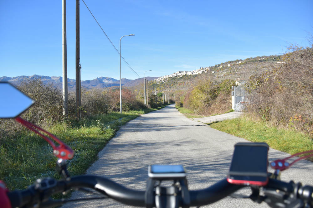 E agora a parte difícil: um caminho pelas montanhas até ao Lago di Barrea. Ontem à noite, em Montenero Val Cocchiara, a aplicação Maps.me dizia-me que não existiam caminhos para bicicleta entre Scontrone e o Lago. Hoje já me dá este caminho – mas é o mesmo dos peões. Ou seja, hoje também já é caminho de bicicleta. Fiquei animada. Mas a minha animação não vai durar muito tempo.