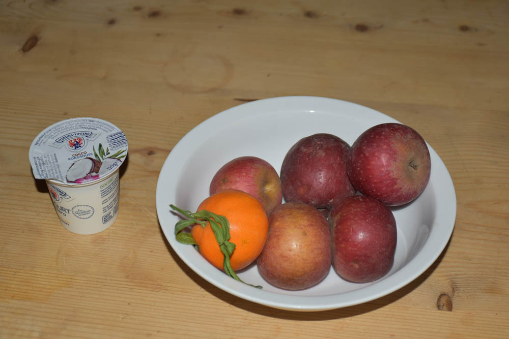 Só me apetece fruta. Vou comer estas cinco maçãs, a tangerina e o iogurte.