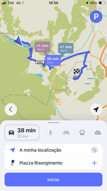 São 12h50 e tenho 25 km pela frente. Os 38 minutos ali indicados é para carros – este percurso é para carros. O meu telemóvel está com 45% da bateria, mas eu trouxe um power bank, está nos alforges. De qualquer forma, indo pela estrada, acho que já nem preciso do GPS, o caminho é sempre em frente até Alfedena.