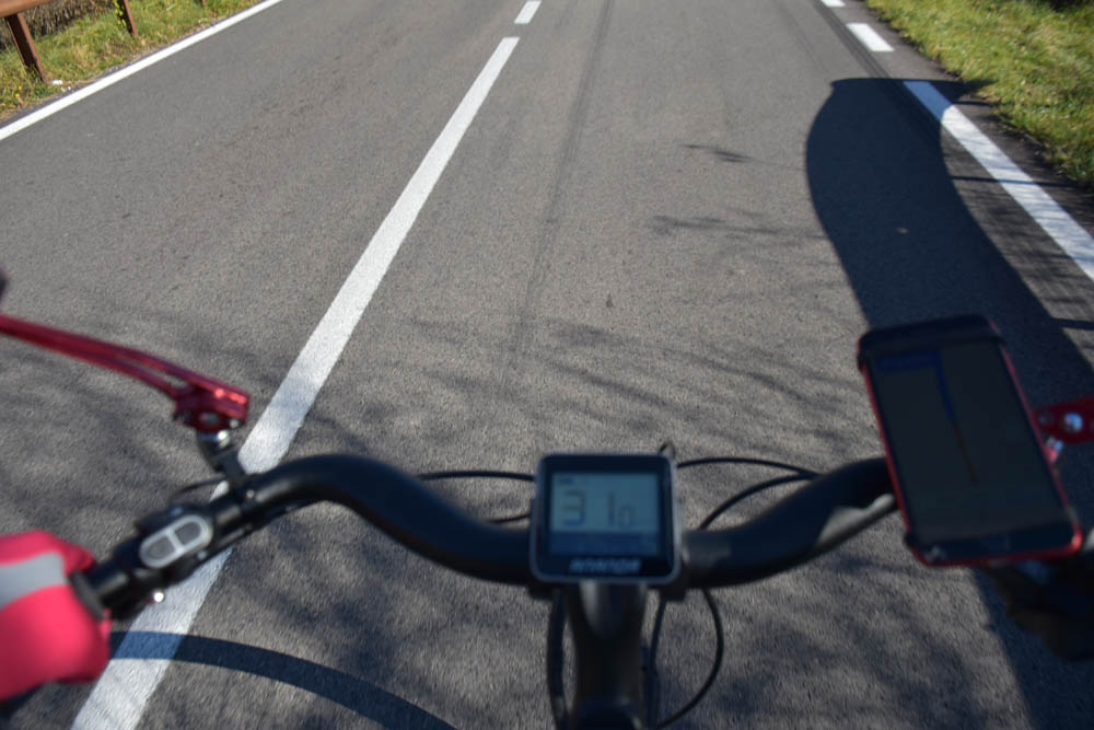 Vou em andamento, a 31 km/hora (19,3 mph) e a bateria da bicicleta só perdeu dois traços. Ainda tenho três traços. Estou numa reta, como se vê ali no GPS.
