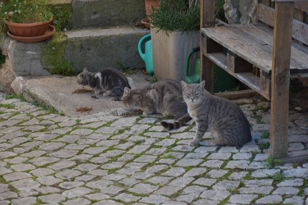 Estes gatos são alimentados todas as manhãs pelo Angelo, da foto abaixo. Eu vi-o sair de casa com a embalagem da ração deles, nas mãos, e os gatos já aqui estavam à espera de si. O primeiro está armado em rufia, a olhar para mim, e não vai comer a sua dose. Tendo eu cuidado de alguns gatos de rua, já tenho a escola toda. Só quer festas, este bicho armado em rufia.