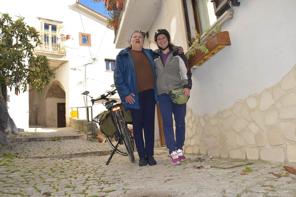 Vem aí a Ambra, de 82 anos, com a sua neta; e atrás está um napolitano, que não fiquei com o nome – está aqui a fazer uma obra (aqueles ferros pertencem à obra). Foi ele quem me tirou a foto acima, com a vista atrás de mim.