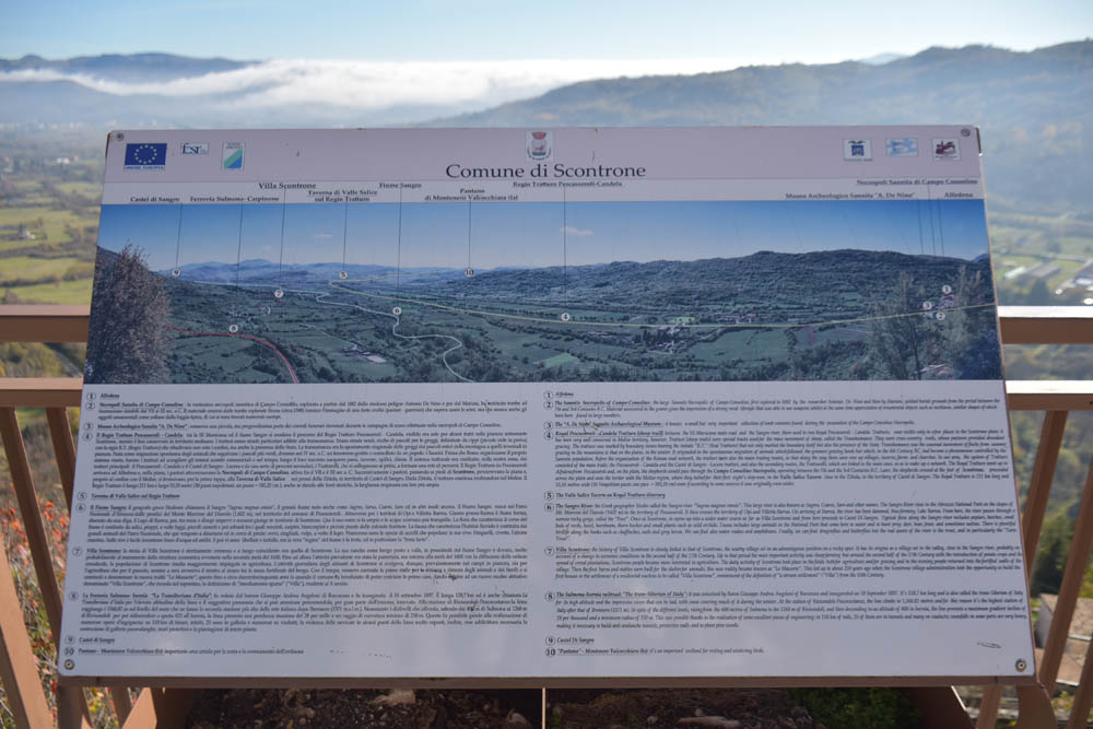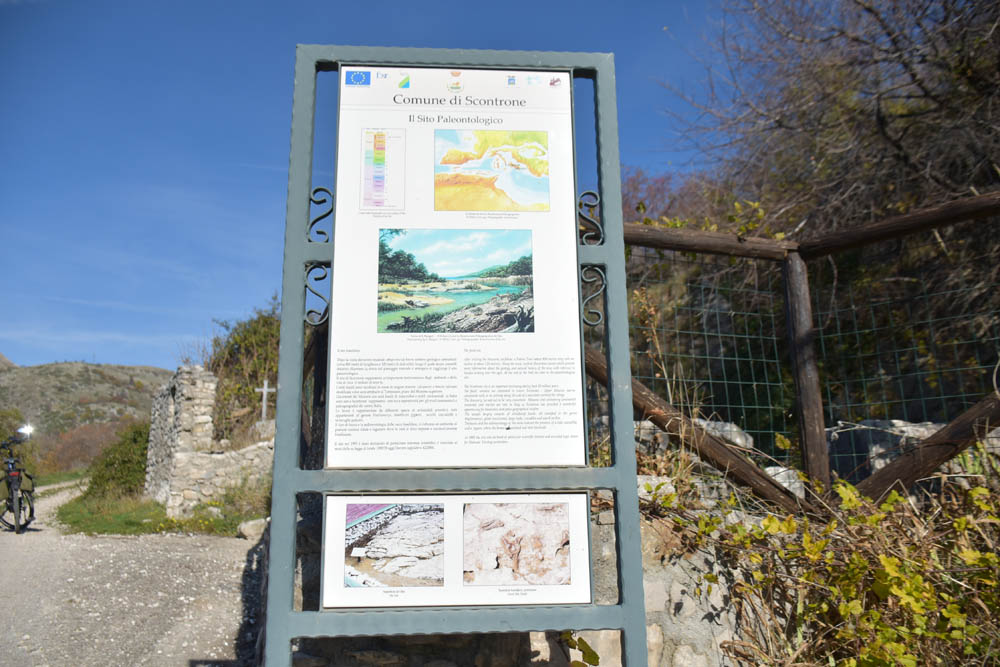 Esta placa, no início do caminho, já tem duas línguas: italiano e inglês. Refere que aqui há um sítio paleontológico, com fósseis datados de há dez milhões de anos.